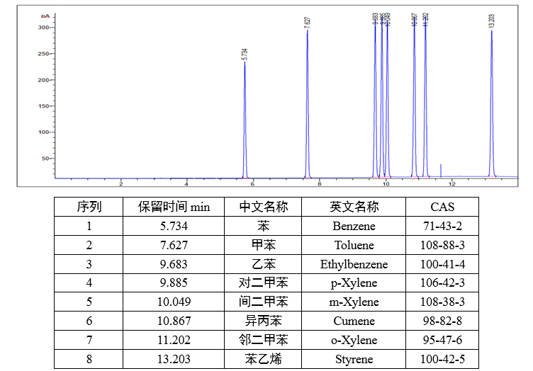 六、適用范圍(本標準溶液適用但不限于以下分析標準) HJ 584[環(huán)境空氣 苯系物的測定 活性炭吸附_二硫化碳解吸-氣相色譜法] 七、分析方法(僅供參考) 1.分析條件: 色譜參考條件: GC-FID 色譜柱: SGE-WAX (30m×0.32mm×0.5μm) 進樣口: 220°C 檢測器: 250°C 柱 箱: 50°C(2min)→6°C/min→120°C(1min) 2. 色譜圖