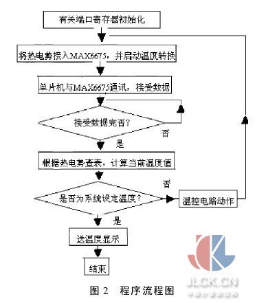 4軟件設(shè)計 系統(tǒng)啟動后,首先將加熱爐等設(shè)備的設(shè)定溫度通過鍵盤接口送入單片機的寄存器,然后讀取MAX6675的測溫數(shù)據(jù),16位的輸出數(shù)據(jù)高位在前,低位在后,然后用二次插值的方法計算出當前溫度值,并與系統(tǒng)設(shè)定溫度進行比較,若當前溫度是設(shè)定溫度則顯示,若超出設(shè)定溫度,則驅(qū)動溫度控制電路動作。軟件程序流程如圖2所示。