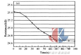 3. 6微氣體傳感器反應(yīng)時間與回復(fù)時間 在傳統(tǒng)甲醛濃度的檢測上,常需要耗費數(shù)小時到數(shù)天不等的時間,而傳感器則必需要求能實時偵測的能力。圖10(a)顯示氣體傳感器在甲醛濃度為3ppm,溫度為300℃的反應(yīng)時間只需70秒。圖10 (b)為其傳感器的甲醛濃度降為0ppm時,在溫度為300℃的回復(fù)時間約80秒左右,實驗證實此傳感器具有快速的反應(yīng)時間與回復(fù)性。