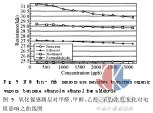 3. 5微氣體傳感器之選擇性 研究中采用甲醇、乙醇、苯等揮發(fā)性有機物在相同條件下,濃度變化對傳感器電阻影響,結(jié)果如圖9中顯示苯的檢測結(jié)果中,電阻并沒有明顯的改變;甲醇、乙醇則須在較高濃度才能讓氧化鎳產(chǎn)生反應(yīng)。乙醇的檢測靈敏度為0. 15kohm/ppb,甲醇的靈敏度為0. 2 kohm/ppb,遠低于對甲醛靈敏度為0. 47 ko-hm/ppb。由圖得知傳感器對甲醇、乙醇、最小偵測極限值約1300ppb,而對于甲醛的最小偵測極限值約800ppb,即開始反應(yīng),相差約500ppb,由上述可顯示氧化鎳(NiO)傳感器對甲醛有較好的感測效果。