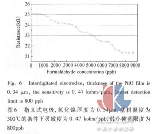 4結(jié)論 本研究利用MEMS技術(shù)成功地設(shè)計并制作出微型的半導(dǎo)體式甲醛氣體傳感器,研究結(jié)論如下所示: (1)本研究所設(shè)計制作之微型甲醛氣體傳感器,加熱電極與指叉式電極在同一層中,目的在給予一穩(wěn)定的熱源與實時的量測電阻的變化。氧化鎳薄膜是利用濺鍍沉積的方式形成感測層,并使用白金作為電極量測感測層電阻之變化。當(dāng)電壓作用到白金加熱板時,微加熱板溫度會逐漸上升。在300℃時,若環(huán)境內(nèi)有甲醛氣體存在時,氧化鎳薄膜層上導(dǎo)電度會增加,因而導(dǎo)致感測層電阻值之降低。在不同的甲醛氣體濃度下,可發(fā)現(xiàn)不同的感測層會有不同的電阻值輸出,此即為本微型甲醛氣體傳感器設(shè)計原理。 (2)本研究制作的微型加熱器,供給5. 2W可達到300℃的量測溫度。 (3)本研究制作的微型甲醛氣體傳感器,經(jīng)測試結(jié)果當(dāng)指叉式電極的膜厚為0. 34μm、工作溫度300℃,其靈敏度可達0. 47 kohm/ppb,最小偵測限度為800 ppb,可產(chǎn)生較佳的靈敏度與小的偵測限度。 (4)研究中分別使用甲醇、乙醇、苯、甲醛這四種揮發(fā)性有機化合物來對本傳感器的靈敏度做相互的比較,在相同溫度范圍之最小氣體偵測濃度,發(fā)現(xiàn)本研究之甲醛氣體傳感器對其他三種揮發(fā)性有機物氣體之靈敏度皆極為微小,可知本研究之甲醛氣體傳感器具有極高之氣體選擇性。 摘自:中國計量測控網(wǎng)