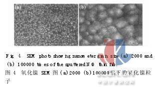 3. 2氣體傳感器SEM圖 圖4中顯示氧化鎳SEM圖,圖中(a)2000倍下的氧化鎳粒子(b)為100000倍下的氧化鎳粒子,圖中的顆粒尺寸約為225~115nm,厚度為0. 52μm。 3. 3微加熱器量測及指叉式電極對靈敏度之影響 圖5為白金電極為加熱電極時的加熱曲線圖,圖中可以發(fā)現(xiàn)消耗功率與溫度呈線性關(guān)系,當(dāng)功率加至5. 2W時,即可得到300℃的工作溫度。(ΔT/W)Power增加1W溫度改變量為57. 6℃。在氧化鎳厚度為0. 34μm,基材溫度為300℃的條件下,判別有無指叉式電極的差異。圖6為指叉式電極,靈敏度為0. 47 kohm/ppb,最小偵測限度為800ppb,而無指叉式電極之感測層,其靈敏度為0. 05 kohm/ppb,偵測限度約為1500ppb,由此可知指叉式電極有穩(wěn)定的工作溫度與良好的感測電極,產(chǎn)生較佳的靈敏度與小的偵測限度。