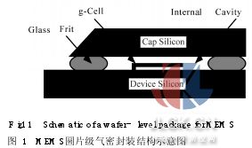 1引言 MEMS器件通常包含一些可動(dòng)部分,這些可動(dòng)部件很脆弱,極易受到劃片和裝配過(guò)程中的灰塵、氣流、水汽、機(jī)械等因素的影響,從而造成器件毀壞或整體性能下降。此外,密封腔內(nèi)氣體的可控性(包括真空)也是影響器件運(yùn)行的一個(gè)很重要的因素[1],例如依靠諧振原理工作的MEMS器件(包括高精度加速度計(jì)、陀螺和RF諧振器等)需要?dú)饷苄苑庋b以維持穩(wěn)定的諧振頻率和氣體阻尼系數(shù)[2]。氣密性封裝還可以降低水氣含量,防止MEMS器件的粘性失效。因此,高可靠的氣密性以及腔體氣體的可控性是保證器件運(yùn)行穩(wěn)定和低漂移的關(guān)鍵所在。目前,靜電鍵合是國(guó)內(nèi)外普遍使用的一種氣密封裝工藝,它具有鍵合強(qiáng)度高、重復(fù)性好、氣密性高等優(yōu)點(diǎn),但是該方法對(duì)鍵合面的清潔度和平整度要求很高,如鍵合前芯片的光學(xué)加工,要求光潔度達(dá)V14級(jí)以上,表面不平整度應(yīng)<50nm[3]。因此,生產(chǎn)效率較低,容易產(chǎn)生開(kāi)裂、自動(dòng)脫落等[4],總體成本較高。相比之下,玻璃漿料低溫鍵合對(duì)于芯片及基板表面無(wú)特殊要求,具有工藝簡(jiǎn)單、性能優(yōu)良、鍵合強(qiáng)度高、密封效果好等優(yōu)點(diǎn),并且可實(shí)現(xiàn)圓片級(jí)的封裝,大大降低了封裝成本。因此,在滿足穩(wěn)定性和可靠性的條件下,采用低溫玻璃鍵合具有可觀的經(jīng)濟(jì)效益。目前國(guó)內(nèi)對(duì)玻璃漿料的制備及單個(gè)元件的氣密封裝有一定研究[5-7],但關(guān)于圓片級(jí)封裝及具體工藝過(guò)程未見(jiàn)報(bào)道。本工作系統(tǒng)地研究了玻璃漿料在低溫下氣密封裝MEMS器件的過(guò)程,并就氣密封裝過(guò)程中參數(shù)的優(yōu)化及封裝后的氣密性等進(jìn)行了研究。 2密封結(jié)構(gòu)的制備 2·1玻璃漿料的選擇 選擇玻璃漿料時(shí)應(yīng)滿足以下幾點(diǎn)要求: (1)熱膨脹系數(shù)與基板材料匹配; (2)封接溫度應(yīng)低于基板材料的耐熱極限溫度; (3)漿料與基板及芯片有良好的浸潤(rùn)性。實(shí)驗(yàn)中采用硅或者玻璃為基板材料。考慮到Al布線,選擇的玻璃焊料的封接溫度應(yīng)低于550℃(Al-Si共熔點(diǎn)577℃)。 選用Ferro公司提供的玻璃漿料,這是一種非晶態(tài)厚膜玻璃,封接溫度約為450℃,熱膨脹系數(shù)90×10-7/℃(與Si 26×10-7/℃以及Pyrex7740玻璃33×10-7/℃接近),并且該玻璃漿料與Si及玻璃基板均有良好的浸潤(rùn)性。利用掃描電鏡上的X-射線能譜儀對(duì)玻璃漿料進(jìn)行得出各組分的百分比MgO:6·59w%t ;Al2O3: 29·76w%t ; SiO2: 43·67w%t ; PbO2:19·09w%t ;ZnO: 0·88w%t。 2·2密封結(jié)構(gòu)的實(shí)現(xiàn) 玻璃漿料通過(guò)絲網(wǎng)印刷在硅蓋板上形成5·5mm×5·5mm的閉合方形環(huán),環(huán)寬0·5mm,印刷厚度50μm。然后將此硅蓋板放入回流爐中進(jìn)行預(yù)燒結(jié),使玻璃漿料中的有機(jī)溶劑完全揮發(fā),并且在硅蓋板上固化成型。預(yù)燒結(jié)完成后的硅蓋板與傳感器芯片對(duì)準(zhǔn)放置,使器件位于玻璃漿料形成的閉合環(huán)中,放入鍵合機(jī)中進(jìn)行燒結(jié),形成密封腔。密封腔單元結(jié)構(gòu)如圖1所示。