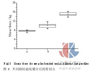 國(guó)內(nèi)已有對(duì)玻璃漿料氣密封裝的研究[8],但是對(duì)基于圓片級(jí)的封裝技術(shù)未見(jiàn)有報(bào)道。實(shí)驗(yàn)中為了便于觀察圓片級(jí)封裝的各環(huán)狀單元玻璃漿料燒結(jié)后的形貌特征,用玻璃圓片代替硅蓋板進(jìn)行鍵合。實(shí)驗(yàn)結(jié)果如圖2所示。 封裝質(zhì)量通過(guò)檢測(cè)各單元的剪切強(qiáng)度及氣密性來(lái)評(píng)定。剪切試驗(yàn)在Dage Series 4000鍵合強(qiáng)度測(cè)試機(jī)上進(jìn)行,對(duì)樣品的統(tǒng)計(jì)數(shù)據(jù)進(jìn)行比較。氣密性檢測(cè)通過(guò)氦氣精檢和氟油粗檢兩步進(jìn)行。氦氣精檢使用Varian 947氦檢漏儀,其檢漏精度為0·2×10-9atm cc/sec。氟油粗檢在KYKY F-3型氟油加壓檢漏儀中進(jìn)行。樣品放入輕氟油(沸點(diǎn)45℃)中,在常溫下保壓4h后取出放入125℃的重氟油(沸點(diǎn)165℃)中觀察是否有連續(xù)氣泡產(chǎn)生。 3實(shí)驗(yàn)結(jié)果及討論 3·1預(yù)燒結(jié)工藝對(duì)鍵合質(zhì)量的影響 預(yù)燒結(jié)選擇在空氣中進(jìn)行,其主要目的是使璃漿料中的有機(jī)溶劑充分揮發(fā)。預(yù)燒結(jié)溫度的選擇直接影響到鍵合質(zhì)量的好壞。分別采用120℃和400℃兩個(gè)典型的預(yù)燒結(jié)溫度,實(shí)驗(yàn)發(fā)現(xiàn),預(yù)燒結(jié)峰值溫度為120℃時(shí),由于峰值溫度未達(dá)到有機(jī)溶劑的沸點(diǎn),玻璃漿料中的有機(jī)溶劑未完全揮發(fā),燒結(jié)后的封環(huán)中有大量的氣泡存在,影響了氣密封裝的質(zhì)量,降低了其可靠性。 3·2燒結(jié)溫度對(duì)鍵合強(qiáng)度的影響 預(yù)燒結(jié)工藝后進(jìn)行燒結(jié)(預(yù)燒結(jié)選擇在空氣中進(jìn)行,峰值溫度為400℃)。圖3為相同預(yù)燒結(jié)條件不同燒結(jié)條件下樣品的剪切力測(cè)量值(a的峰值溫度為400℃, b的峰值溫度為450℃, c的峰值溫度為500℃)。圖中方框的中心代表樣品剪切力的平均值,方框的厚度表示結(jié)果的標(biāo)準(zhǔn)均方差,而豎線的頂端和底部相對(duì)應(yīng)的十字叉形分別表示剪切力的最大值和最小值。