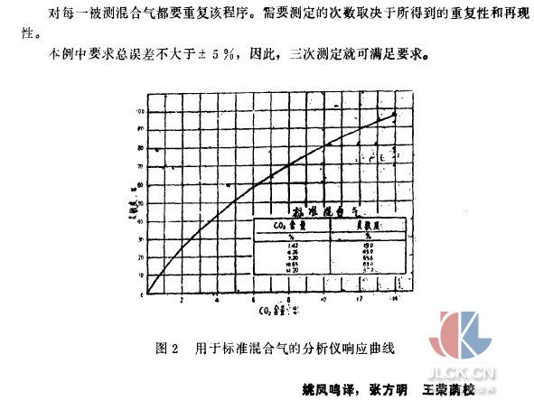 3.3多點(diǎn)校正的比較法 用多個標(biāo)準(zhǔn)混合氣可以測定分析儀響應(yīng)曲線(線性或非線性)。該校準(zhǔn)法允許所用分析儀在整個有用的響應(yīng)曲線范圍內(nèi)比較。為消除對分析儀響應(yīng)曲線可能的干擾,標(biāo)準(zhǔn)混合氣及那些被比較的氣體必須具有相同的組分,除非已知這些組分不致影響分析儀的響應(yīng)曲線。 利用必需數(shù)目的標(biāo)準(zhǔn)混合氣,對每種已知的混合氣測定分析儀響應(yīng)值,然后統(tǒng)計確定響應(yīng)曲線。標(biāo)準(zhǔn)混合氣的使用數(shù)目依賴于分析儀響應(yīng)曲線的形狀,但最少需要三種標(biāo)準(zhǔn)混合氣。校正之后,對被比較的混合氣可在已知分析儀響應(yīng)值條件下進(jìn)行分析,只要待測混合氣的濃度分別地不超過或不低于已知最高或最低濃度所得到的響應(yīng)值即可。多點(diǎn)校準(zhǔn)所需重復(fù)次數(shù)取決于所專用分析儀的運(yùn)行曲線。為得到一個真實的代表性的分析儀響應(yīng)值所需測定點(diǎn)數(shù)目,需用統(tǒng)計法確定,而且,事先要考慮到分析儀所需精度和準(zhǔn)度。 多點(diǎn)校準(zhǔn)的實例在附錄中給出。 附錄 多點(diǎn)校準(zhǔn)的實例 本例采用比較法和多點(diǎn)校準(zhǔn)法對一組含CO2的標(biāo)準(zhǔn)混合氣的濃度進(jìn)行測定,CO2濃度范圍為0~14%所用比較法采用了非色散紅外分析儀和一組已知的并驗證過濃度的CO2標(biāo)準(zhǔn)混合氣,在此基礎(chǔ)上測定分析儀的響應(yīng)值。已知CO2標(biāo)準(zhǔn)混合氣的準(zhǔn)度是正負(fù) 1%,要求被測混合氣總的測定誤差不超過CO2組分的士5%。 在0~10~30~50~75和95%的有用分析儀范圍內(nèi),用標(biāo)準(zhǔn)混合氣測定非色散紅外分析儀的響應(yīng)值。選擇這些點(diǎn)數(shù)以準(zhǔn)確地確定分析儀響應(yīng)值,以得到所需的總誤差為士5%。回歸計算之后畫出分析儀響應(yīng)曲線,示于圖2。儀器的響應(yīng)值易發(fā)生小的變化,這些變化要參照標(biāo)準(zhǔn)混合氣來校正,該標(biāo)準(zhǔn)混合氣的濃度非常接近于待測混合氣。這些變化的程度只能以特定的儀器通過經(jīng)驗來測定。在本例中,分析儀響應(yīng)曲線在任何點(diǎn)變化必須小于相對值士2%。如果這樣,或如果響應(yīng)值的穩(wěn)定度未知,則整個響應(yīng)曲線在每次使用時必須重新確定。 對于標(biāo)準(zhǔn)混合氣和待測樣品的測量要重復(fù)三次側(cè)量分析儀響應(yīng)值。 本例標(biāo)準(zhǔn)混合氣中的CO2濃度值為7. 20%,待測樣品濃度的修正值由下式給出: