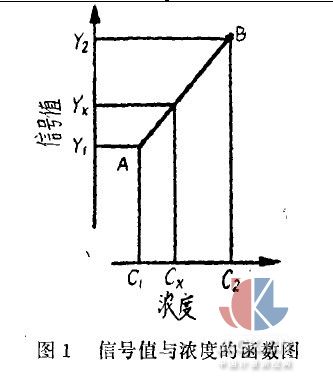 式中,Y可按Y測量的可潔度為95%時,按n次測量的平均值計算;Sv是測量偏差是Studnt一Fischer系數(shù)。 隨著測量次數(shù)的增加,會越來越接近真值,這樣,誤差影響可減少到最低程度。 3.2用兩個標(biāo)準(zhǔn)混合氣的比較法 應(yīng)用兩個標(biāo)準(zhǔn)混合氣時可忽略分析儀響應(yīng)曲線的形狀。標(biāo)準(zhǔn)混合氣的成分必須與波分析混合氣的成分相同。令Y表示由濃度C得到的分析儀示值,給定C1< Cx 近C x,這樣,AB段與此測量范圍內(nèi)的分析儀曲線相重合〔見圖1)。