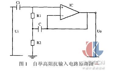 其基本原理為:通過電容C的正反饋,把電阻R2上的電位抬高(自舉),使電阻R1的兩端幾乎為等電位狀態(tài),于是,輸入回路的電流幾乎為零,從而實(shí)現(xiàn)了高的輸入阻抗。其輸入阻抗可近似由式(1)進(jìn)行計(jì)算: