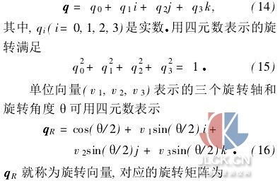 其中,R是3×3的旋轉(zhuǎn)矩陣;T是3×1的平移矩陣。 關(guān)于這個最優(yōu)問題,可以用基于四元數(shù)(quaternions)的非迭代算法,在三維情況下,可以用四元數(shù)(三個旋轉(zhuǎn)軸,一個旋轉(zhuǎn)角度)表示R3中的旋轉(zhuǎn),四元數(shù)有如下形式