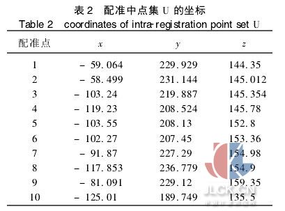 2空間配準(zhǔn)中的應(yīng)用 手術(shù)導(dǎo)航系統(tǒng)中,空間配準(zhǔn)(registration)主要用于手術(shù)前的計劃和手術(shù)中的處理[7,8]·通過對由位置傳感器確定的坐標(biāo)空間和術(shù)前多模態(tài)醫(yī)學(xué)圖像確定的坐標(biāo)空間配準(zhǔn),導(dǎo)航系統(tǒng)可以將術(shù)前重建所得的虛擬數(shù)據(jù)與術(shù)中空間位置的數(shù)據(jù)實(shí)時地聯(lián)系起來,這樣就消除了醫(yī)生僅憑主觀判斷將多模態(tài)醫(yī)學(xué)圖像與實(shí)際手術(shù)過程相匹配時可能引起的誤差,減小了手術(shù)的復(fù)雜性和危險性,縮短了手術(shù)時間[9]·空間配準(zhǔn)是一個坐標(biāo)空間和另一個坐標(biāo)空間一對一的映射或變換,即兩個不同空間中相對應(yīng)于同一醫(yī)學(xué)解剖特征的兩點(diǎn)之間的映射·空間配準(zhǔn)是手術(shù)導(dǎo)航系統(tǒng)中的一個十分關(guān)鍵的技術(shù)。 下面將詳細(xì)介紹四元數(shù)法在手術(shù)導(dǎo)航系統(tǒng)空間配準(zhǔn)中的應(yīng)用·為簡化起見,僅研究對應(yīng)空間點(diǎn)集的配準(zhǔn)方法。 2.1配準(zhǔn)方法 假設(shè)一一對應(yīng)的兩個空間點(diǎn)集U和X的坐標(biāo)已給定,每個點(diǎn)集有n個點(diǎn), U={ui,i=0,1,2,…, n}和X={xi,i=0,1,2,…, n},每對點(diǎn)ui,xi有m個坐標(biāo)ui=(ui1,ui2,…,uim),xi=(xi1,xi2,…,xim)·為了使它們配準(zhǔn)起來,就是要找到最優(yōu)的旋轉(zhuǎn)矩陣R和平移向量T,滿足目標(biāo)表達(dá)式