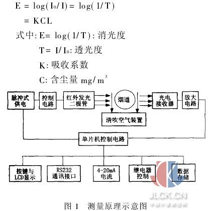HG-HC智能煙塵粉塵測(cè)量?jī)x是一光學(xué)式電子儀器,是一種在線監(jiān)測(cè)儀器。它的檢測(cè)原理是基于光學(xué)式檢測(cè)法中的濁度法?;诶什畷r(shí)—比爾定律,測(cè)量光透過(guò)被測(cè)物質(zhì)后,由于散射和吸收而使光強(qiáng)減弱,通過(guò)測(cè)定光束通過(guò)被測(cè)介質(zhì)前后的光強(qiáng)比值來(lái)定量煙塵粉塵濃度。檢測(cè)原理及系統(tǒng)結(jié)構(gòu)如圖1所示。
