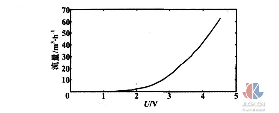 本文研究的新型氣體流量計(jì)最終要把電壓信號轉(zhuǎn)變?yōu)橄鄬?yīng)的數(shù)字信號。這里,需要使用流量對應(yīng)信號電壓的函數(shù)Q=F(U),且實(shí)驗(yàn)表明函數(shù)Q=F(U)更容易擬合處理[4],所以可以把探頭特性曲線表示成待擬合試驗(yàn)數(shù)據(jù)點(diǎn)。熱式流量計(jì)輸出擬合曲線如圖4所示。