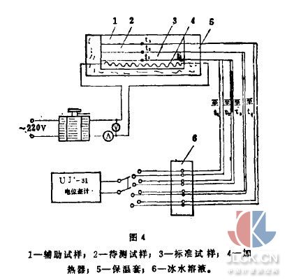 裝置非常簡單,只需一個主加熱器作熱源。在t1,t2,t3,t4處各安裝一對熱電偶。標準試樣與待測試樣均為直徑165xl5的板狀試樣;輔助試樣為直徑165x20豪米板狀試樣。它們的材質均相同。 3.試驗方法 將220伏交流電送入系統(tǒng)中,調節(jié)自藕變壓器,根據(jù)試驗溫度要求,使t4恒定在某一溫度,一般在200~300Oc內。恒溫十分鐘后即可用UJ一31型電位差計測試高溫點t1、中溫點t2和低溫點t3一組數(shù)據(jù),每隔5一10分鐘再測t1,t2,t3一次,共測5~6組數(shù)據(jù),以平均值計算入2。 該法測得的導熱系數(shù)其絕對誤差值△入為0.0063大卡/米·時·度,其誤差百分率為△入%=2.493%。 對導熱系數(shù)側定而言,這樣的誤差范圈是比較理想的。 摘自:中國計量測控網(wǎng)