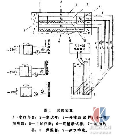 試驗裝置見圖1。220伏交流電經過三個自根變壓器分別送入主加熱器,側加熱器和底加熱器。各加熱器分別裝有電壓表、電流表控制電壓和電流,達到升溫、降溫、保溫和調節(jié)溫度平衡的目的。加熱器上方的主、輔試樣,在各個界面上均裝有厚2~3毫米的紫銅板作界面藕合用。熱電偶就焊接在這個藕合紫銅板上。在t1,t2,t3,t4,t5位置各安裝一對熱電偶。 熱電偶冷端插入冰水溶液中。測溫儀表選用UJ一31型電位差計(也可選用UJ一36型電位差計,XWC系列儀表,也可在各測溫點分別接0~1600.c高溫毫伏計測溫)。 主試樣為直徑105x20毫米圓板狀試樣,外輔助試樣為直徑165/105x20毫米圓環(huán)形試樣,下試樣為直徑165x20毫米圓板狀試樣。主試樣與輔助試樣均用同樣材料、同樣加工方法制成。主試樣與側試樣要緊密接觸,兩者甚至可以制成一整塊直徑165x20毫米的圓板形試樣。試樣要平整、無缺角、表面光滑、便于機合。試驗前,試樣在105一110oC烘箱中烘至恒重。 用電爐盤作加熱器。主加熱器直徑為小100毫米,電阻仇為35歐;側加熱器為圓環(huán)狀,直徑為165/105毫米,電阻值為40歐。底加熱器直徑為165,電阻值50歐。各加熱器加熱元件均用直徑0.6毫米的鎳鉻絲。 水冷卻器由紫銅板焊接而成,直徑為直徑165毫米,厚為30毫米。為防止試樣冷卻面冷卻時溫度不均勻,將冷卻器的水道溝焊成螺旋形或如圖2的形式。