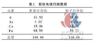 但21-4N冷拉棒材在生產(chǎn)過程中產(chǎn)生的表面裂紋,雖然經(jīng)過表面磨制,仍有少量表面裂紋未處理掉,裂紋內(nèi)充滿氧化物夾雜,見圖2。夾雜性質(zhì)見電鏡掃描數(shù)據(jù)(表1)。