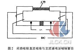 2磁粉探傷工藝 2.1磁化方法 根據(jù)現(xiàn)有插銷的狀況、探傷設(shè)備條件和性能、工藝操作的特性,以及插銷形狀、大小、生產(chǎn)數(shù)量的要求,選用交直流復(fù)合磁場(chǎng)對(duì)插銷進(jìn)行濕式連續(xù)法探傷。濕式連續(xù)法是將插銷放置在通有電流的設(shè)有線圈的TC-4000固定式磁粉探傷機(jī)的夾持頭兩端之間,選擇交直流方式,使之得到縱向和周向磁化,即可實(shí)現(xiàn)復(fù)合磁化。 磁場(chǎng)方向與顯現(xiàn)缺陷能力有很大關(guān)系,磁化場(chǎng)垂直于缺陷時(shí),磁粉顯現(xiàn)的缺陷最清晰,磁化場(chǎng)傾斜于缺陷時(shí),磁粉顯現(xiàn)缺陷能力變差,探測(cè)靈敏度下降,由于不連續(xù)取向很難預(yù)知,采用復(fù)合磁化技術(shù)可補(bǔ)充單一采用周向交流磁化只能探測(cè)與插銷軸向平行的裂紋。交直流復(fù)合磁化速度快,一次即可完成不同方向的磁化,可發(fā)現(xiàn)零件上不同方向的不連續(xù)。在固定式探傷機(jī)上采用通電濕連續(xù)法,多個(gè)零件磁化時(shí),須將插銷首尾相抵,兩個(gè)或四個(gè)串接,再進(jìn)行磁化。交直流復(fù)合磁化見(jiàn)示意圖2。