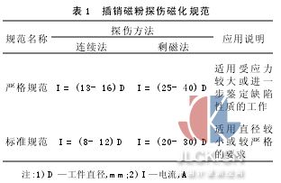 2.2靈敏度試片 插銷的質(zhì)量考核,客戶沒(méi)有提供有關(guān)技術(shù)要求,只要求能檢出使插銷失效的缺陷。為使探傷結(jié)果具有良好的可靠性和再現(xiàn)性,依據(jù)探傷實(shí)際,選用A1-30/100型高靈敏度試片,并按規(guī)定正確使用。圓形不連續(xù)的附帶優(yōu)點(diǎn)是指出最大磁場(chǎng)強(qiáng)度的方向和靈敏度的角寬容度界限。這種標(biāo)準(zhǔn)試片在建立多向磁化時(shí)可以加以利用,以保證磁化工件時(shí)試件上任何一點(diǎn)上所有方向上的磁場(chǎng)都是平衡的。選用A1-30/100試片是用于檢驗(yàn)磁粉探傷設(shè)備、磁粉和磁懸液的綜合性能及系統(tǒng)靈敏度,并可直接驗(yàn)證探傷工藝規(guī)程和操作方法是否妥當(dāng)。 2.3磁化規(guī)范 制定磁化規(guī)范一般有(1)用經(jīng)驗(yàn)公式;(2)用儀器測(cè)被測(cè)工件表面的磁場(chǎng)強(qiáng)度;(3)測(cè)繪鋼的磁性曲線;(4)用標(biāo)準(zhǔn)試片確定大致磁化規(guī)范。因插銷用在受剪切力的重要場(chǎng)合,應(yīng)選用嚴(yán)格磁化規(guī)范,選用經(jīng)驗(yàn)公式計(jì)算與參考鋼材磁特性曲線方法,最后用A1型靈敏度試片確定插銷磁化規(guī)范。磁化規(guī)范見(jiàn)表1。