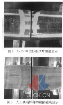 2.3 磁粉探傷機(jī)組成 2.3.1 該磁粉探傷機(jī)由上料輸送裝置、磁化夾持裝 置、電氣控制與磁化回路裝置、磁粉施加裝置、暗室與照明裝置、旋轉(zhuǎn)觀察裝置、退磁裝置、攝像機(jī)系統(tǒng)、計(jì)算機(jī)圖像采集處理系統(tǒng)組成。 2.3.2 主機(jī)共有8 個(gè)工位,分為上料、預(yù)噴淋、磁化、空工位、旋轉(zhuǎn)觀察、空工位、退磁、下料。工位間距為250mm,步進(jìn)輸送采用氣缸傳動(dòng)。 2.3.3 磁化夾持裝置采用氣缸夾持方式,可根據(jù)工件長(zhǎng)度,預(yù)先調(diào)整好一側(cè)磁化夾頭間距??蓾M足260mm~760mm之間的工件夾持通電。夾緊氣缸可調(diào)整行程阻尼,運(yùn)行比較平穩(wěn)。 2.3.4 電氣控制與磁化回路裝置安裝在一個(gè)控制柜內(nèi)(不包括磁化用主變壓器),監(jiān)視器和按鈕安裝在控制柜正面,便于觀察操縱。電氣控制可選擇程序動(dòng)作的自動(dòng)控制或單一機(jī)械電氣動(dòng)作的手動(dòng)控制。磁化電流設(shè)有上下限閘門(mén)保護(hù)線路,防止磁化電流波動(dòng)。 2.3.5 磁粉施加裝置采用電動(dòng)泵循環(huán)磁懸液,使用時(shí)流量可調(diào)節(jié)。 2.3.6 旋轉(zhuǎn)觀察裝置采用伺服電機(jī)控制工件旋轉(zhuǎn),速度可調(diào),實(shí)現(xiàn)動(dòng)態(tài)觀察。旋轉(zhuǎn)裝置還備有暫停按鈕,具有點(diǎn)動(dòng)正轉(zhuǎn)、反轉(zhuǎn)功能。操作者對(duì)缺陷質(zhì)疑部位能調(diào)整到最佳觀察位置,做出準(zhǔn)確判斷。 2.3.7 旋轉(zhuǎn)觀察工位采用局部暗室,操作人員只需在可見(jiàn)光操作室內(nèi)工作。 2.3.8 選用具有自動(dòng)聚焦、清晰度高、低噪聲和抗電磁干擾性強(qiáng)等優(yōu)點(diǎn)的日本CONICE 公司的彩色高分辨率CCD 攝像機(jī)。攝像機(jī)固定架上裝有一臺(tái)電機(jī),可上、下調(diào)節(jié)攝像機(jī)的高度,調(diào)節(jié)范圍為350mm,可滿足各種規(guī)格工件的觀測(cè)。在圖像采集時(shí),用氣缸帶動(dòng)暗室前、后兩側(cè)的小閘門(mén)遮住前、后兩側(cè)的可見(jiàn)光線,便于采集到清晰的圖像。 2.3.9 按工件規(guī)格和形狀采用兩個(gè)CCD 攝像機(jī)同時(shí)采集被檢工件表面的磁痕圖像,在計(jì)算機(jī)監(jiān)視器上實(shí)現(xiàn)圖像分割畫(huà)面顯示。每幅畫(huà)面具有單獨(dú)放大顯示功能,有利于缺陷觀察和判斷。 2.3.10 計(jì)算機(jī)圖像采集處理系統(tǒng)可對(duì)磁痕圖像進(jìn)行A/D 轉(zhuǎn)換,并可作降噪、邊緣平滑度拉伸和幾何測(cè)長(zhǎng)等圖像處理,還可對(duì)磁痕圖像進(jìn)行打印、存檔等。 2.3.11 退磁裝置采用二端退磁線圈同時(shí)通過(guò)電流衰減法來(lái)進(jìn)行退磁,可使退磁動(dòng)作簡(jiǎn)單、可靠。 2.3.12 主要部件為國(guó)外名牌產(chǎn)品,如可編程控制器和伺服電機(jī)均采用日本三菱產(chǎn)品,紫外線燈采用美國(guó)SPECTRONICS 公司產(chǎn)品,其余部件均為國(guó)內(nèi)名牌產(chǎn)品。 3 主要性能特點(diǎn) 3.1 傳動(dòng)裝置采用氣動(dòng)步進(jìn)。檢測(cè)時(shí)間可根據(jù)用戶實(shí)際需要現(xiàn)場(chǎng)調(diào)整,以保證達(dá)到最佳效果。同時(shí)設(shè)有自動(dòng)、手動(dòng)選擇開(kāi)關(guān),在手動(dòng)模式下,可實(shí)現(xiàn)單步操作;在自動(dòng)模式下,PLC 控制能自動(dòng)完成上料、送料、夾緊、噴灑磁懸液、磁化、松開(kāi)、旋轉(zhuǎn)、退磁、下料的全部過(guò)程,減輕檢測(cè)人員的勞動(dòng)強(qiáng)度,并提高了檢測(cè)的速度。 3.2 用計(jì)算機(jī)可將高清晰度的CCD 攝像機(jī)拍攝到的旋轉(zhuǎn)觀察工位的被檢工件表面磁痕圖像進(jìn)行降噪、放大、縮小等處理,操作人員直接觀察計(jì)算機(jī)監(jiān)視器,就可以清楚地觀察被檢工件表面磁痕,進(jìn)行實(shí)時(shí)檢測(cè)。在控制臺(tái)上還設(shè)有暫停、正、反轉(zhuǎn)控制鈕,可實(shí)現(xiàn)對(duì)被檢工件表面的任意部位的細(xì)致觀察。 3.3 經(jīng)過(guò)處理的圖像可以遠(yuǎn)程監(jiān)控。 3.4 圖像處理軟件有缺陷幾何測(cè)長(zhǎng)功能,處理的圖像可保存、打印,使檢測(cè)結(jié)果具有了可追溯性。 4 主要技術(shù)指標(biāo) 4.1 適用檢測(cè)工件規(guī)格尺寸: 工件長(zhǎng)度:260 mm~760mm; 工件直徑:準(zhǔn)76 mm~準(zhǔn)155mm; 工件重量:≤50kg。 4.2 整機(jī)步進(jìn)節(jié)拍:≤30 秒/ 件(可調(diào)節(jié));各工位動(dòng)作時(shí)間:≤10 秒。 4.3 供電電源:三相50Hz 380V;瞬時(shí)最大功率:90kW。 4.4 磁化:可分別進(jìn)行周向、縱向磁化,也可進(jìn)行復(fù)合磁化,電流連續(xù)可調(diào),精度5%。 周向磁化:0A~4000A (交流) 縱向磁化:0A~4000A (交流)(或磁動(dòng)勢(shì)≥20,000AT) 4.5 檢測(cè)靈敏度:一次磁化A-15/50 型標(biāo)準(zhǔn)試片及某沖拔件的人工缺陷樣件的缺陷均顯示清晰,如圖2、圖3 所示。