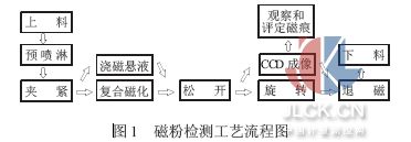 1 前言 沈陽(yáng)東基工業(yè)集團(tuán)有限公司生產(chǎn)的某沖拔件在加工生產(chǎn)過(guò)程中,采用磁粉檢測(cè)工藝以檢驗(yàn)工件表面及近表面是否存在缺陷。過(guò)去一直采用手工操作的簡(jiǎn)易磁粉檢測(cè)方法,周向、縱向分別單獨(dú)磁化,設(shè)備陳舊,檢測(cè)靈敏度低,很難滿足產(chǎn)品質(zhì)量指標(biāo)。為解決無(wú)損檢測(cè)水平低、檢測(cè)人員勞動(dòng)強(qiáng)度大、工作環(huán)境差等問(wèn)題,我們聯(lián)合研制開(kāi)發(fā)了CJW-4000型圖像顯示交流自動(dòng)熒光磁粉探傷機(jī),并已應(yīng)用于沈陽(yáng)東基工業(yè)集團(tuán)有限公司某沖拔件機(jī)加生產(chǎn)線在線磁粉檢測(cè),滿足了某沖拔件無(wú)損檢測(cè)技術(shù)要求,取得了良好的經(jīng)濟(jì)效益和社會(huì)效益。 2 磁粉探傷機(jī)工作原理及組成 2.1 工作原理 周向磁化采用直接通電,電流沿工件軸向通過(guò),在工件上產(chǎn)生周向磁場(chǎng),可檢測(cè)工件表面和近表面的縱向缺陷。用線圈法對(duì)工件縱向磁化,產(chǎn)生縱向磁場(chǎng),可檢測(cè)工件表面和近表面的周向缺陷。同時(shí)施加周向和縱向磁化電流,即復(fù)合磁化,在工件上形成交變旋轉(zhuǎn)矢量磁場(chǎng),在連續(xù)法檢測(cè)時(shí),可檢測(cè)工件表面和近表面各個(gè)方向的缺陷。退磁采用交流衰減法。 采用CCD 攝像機(jī)采集被檢工件表面的磁痕圖像,經(jīng)計(jì)算機(jī)圖像采集處理系統(tǒng)對(duì)磁痕圖像進(jìn)行A/D 轉(zhuǎn)換后顯示在計(jì)算機(jī)監(jiān)視器上。 2.2 工藝流程 該磁粉探傷機(jī)采用復(fù)合磁化濕法連續(xù)法檢測(cè)工藝,工藝流程如圖1 所示。