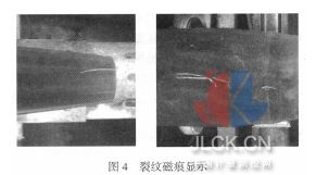 4.6 退磁線圈磁場(chǎng)強(qiáng)度≥16000A/m;退磁后剩磁值≤3 Gs。 4.7 被檢工件在旋轉(zhuǎn)觀察工位的旋轉(zhuǎn)時(shí)間可根據(jù)用戶實(shí)際需要預(yù)設(shè)定在PLC 中,本機(jī)設(shè)定旋轉(zhuǎn)時(shí)間為20 秒;工件旋轉(zhuǎn)時(shí)徑向跳動(dòng)公差≤0.5 mm。 4.8 工件表面紫外線燈輻射照度≥800μW/cm2。 4.9 供氣氣源:≥0.5 MPa。 5 結(jié)束語(yǔ) CJW-4000 型圖像顯示交流自動(dòng)熒光磁粉探傷機(jī)自投入應(yīng)用以來(lái),已有四年多的時(shí)間,一直處于運(yùn)行狀態(tài),性能穩(wěn)定,檢驗(yàn)了多批多種規(guī)格的某沖拔件,檢出了多種表面和近表面的缺陷,有些缺陷很細(xì)微,有的則較嚴(yán)重, 如圖4 所示。