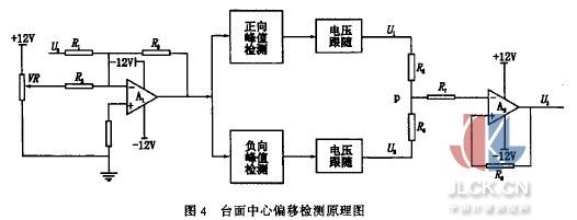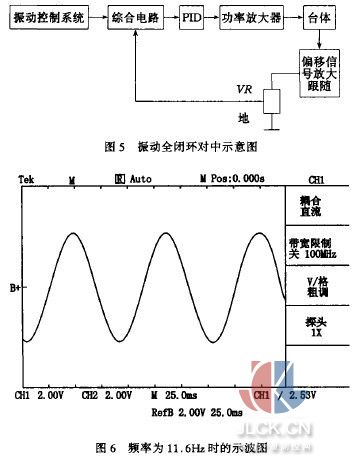 如圖4所示,在機械零位時,讓電渦頭對準AB和AC的中線(參見圖3),調(diào)節(jié)電位器VR,使Al輸出為0,如果振動臺在臺面中心上下振動,則輸 出上下對稱的正弦波。這樣加在u;與u:之間為絕對值相等的正負電壓,RS與R6中間點的電位尸為。。如果臺體不在臺面中心振動,則尸不為O。尸的大小和 正負可以分別反映振動臺振動過程中,偏離臺面中心的程度和偏離方向。通過運算放大器氣引出該電壓值。然后再如圖5所示,將該偏差電壓引入振動臺閉環(huán)控制系 統(tǒng)中,用VR調(diào)節(jié)反饋量大小。實踐證明,采用該電路的對中方法很好地解決了振動臺臺面振動過程中的動態(tài)對中問題。