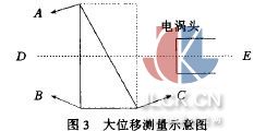 3 基于該位移測量方法的電磁振動臺對中方法 有了上述測量大位移的新方法,我們可以很容易地解決電磁振動臺的對中間題。具體思路是這樣的:如圖3,考慮到振動臺最大位移為51~,并留有裕 度。取AB長為60mm,按上面所設置的間距,臺面振動過程中,由于留有足夠空隙,不會發(fā)生碰撞。把劈固定在振動臺上,將電渦頭固定在臺座上,當臺面上下 振動時,電渦頭與三角劈之間的距離發(fā)生了變化,后面相連的放大器輸出電壓就可以反映臺面的位移。我們已經(jīng)知道當間距在0.5一6mm之間變化時,電渦頭所 帶的單電源放大器輸出在一0.82一一10.07V之間變化。平常振動臺未加電時,調(diào)節(jié)電渦頭指向臺體機械零位,該位置設置在平行于底邊Bc的中線DE 處,然后,采用圖4電路檢測振動臺臺面中心的偏移情況。