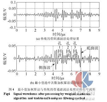 從圖 3(a)的原始信號波形可以看到,受噪聲的影響,原始信號的信噪比是比較低的,各目標(biāo)回波的波形也無法分清,影響了 TOFD 法的定位和定量。下面采用分離譜算法對原始信號進(jìn)行處理。 根據(jù)分離譜算法的原理,實驗采用 N=15 個等帶寬的高斯窄帶通濾波器組成的濾波器組對預(yù)處理后的信號進(jìn)行分離(起始濾波器中心頻率為0.9MHz;相鄰濾波器中心頻率間隔為 0.4MHz;濾波器帶寬為 0.8MHz),濾波器帶寬為相鄰濾波器中心頻率間隔的 2 倍,窄帶濾波器所覆蓋的處理頻閾寬度為信號頻譜的 3dB 帶寬,由此得到中心頻率各不相同的 15 組窄帶信號。在信號恢復(fù)階段采用線性平均、極性閾值、極性閾值+最小值、最小值等四種恢復(fù)算法進(jìn)行信號的重建,所得結(jié)果分別如圖3(b)~3(e)所示, 線性平均算法的處理效果最差,而極性閾值算法和最小值+極性閾值算法雖然濾波效果很明顯,但信號的失真現(xiàn)象比較嚴(yán)重,最小值算法既滿足了信號增強(qiáng)的要求, 又能減少信號的失真。但最小值算法的最大缺點是對濾波器的數(shù)目比較敏感,不同的濾波器數(shù)目將產(chǎn)生差別較大的處理結(jié)果,這個缺點使得最小值恢復(fù)算法的應(yīng)用受 到很大的限制。而本文采用的最小值選中次數(shù)加權(quán)恢復(fù)算法(結(jié)果如圖 3(f)所示)與最小值算法對信號的處理效果相差不大,甚至本文的算法對信號的增強(qiáng)效果更為明顯。而且最小值選中次數(shù)加權(quán)算法無需信號和噪聲頻譜的先驗知 識,對濾波器的數(shù)目也不敏感,具有一定的自適應(yīng)能力,從而很好地彌補(bǔ)了最小值算法的缺陷。 另外,與傳統(tǒng)的帶通濾波法相比,基于分離譜技術(shù)的最小值選中次數(shù)加權(quán)算法能夠有效地減少結(jié)構(gòu)噪聲對衍射回波的干擾,使缺陷端部衍射回波能夠被準(zhǔn) 確識別,減少了時間測量的不確定性對定位和定量精度的影響,從而保證了 TOFD 法中缺陷定位和定量的準(zhǔn)確性。假定反射波的中心頻率沒有發(fā)生漂移,與發(fā)射波的中心頻率相同,則可以用一個中心頻率為5MHz的帶通濾波器對反射波進(jìn)行濾 波,其通頻帶寬通常取 2MHz。濾波后的波形與最小值選中次數(shù)加權(quán)算法處理后波形比較如圖 4。