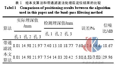 c -縱波在材料中的聲速(實測為 5765m/s) t -孔的端部衍射波與側(cè)向波的時差 s -兩探頭入射點間距的一半 d -孔的埋藏深度(與板面的距離) 將各參數(shù)代入后計算兩種方法處理后的檢測結(jié)果,如表 1 所示。