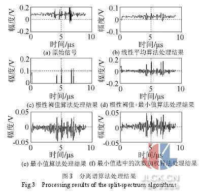 1 引 言 TOFD 超聲波衍射時間差(time-of-flight-diffrac-tion, TOFD)測量技術(shù)[1]是一種可以精確定量的檢測技術(shù),該方法通過測量缺陷邊緣的衍射超聲波信號之間傳播的時間差,對缺陷的位置和大小進(jìn)行測量。該技術(shù) 融合了超聲波檢測和射線檢測的優(yōu)點,能夠?qū)θ毕轀?zhǔn)確地定性和定量。在發(fā)達(dá)國家,TOFD檢測技術(shù)近年來已被廣泛應(yīng)用于中厚板對接焊縫的檢測與缺陷定量中, 國內(nèi)也在積極推進(jìn) TOFD 方法代替射線檢測的標(biāo)準(zhǔn)。TOFD 法依賴于超聲波與缺陷端部的相互作用而在較大角度范圍內(nèi)發(fā)射的衍射波,檢出衍射波就能確定缺陷的存在,而信號傳播的時間差就是缺陷高度量值。缺陷尺寸根據(jù) 衍射信號傳播的時間而非幅度來測量。因此,對端部衍射信號的時間差測量就成為TOFD缺陷定量的關(guān)鍵。但是超聲信號容易受到材料的結(jié)構(gòu)噪聲以及儀器電噪聲 等噪聲影響,且由于 TOFD 技術(shù)檢測的是相對微弱且指向性差的衍射波信號,導(dǎo)致端點衍射回波容易被雜波所淹沒或者波幅太低難以識別,使信號的時間差測量誤差增大,從而使缺陷定量時的 誤差相應(yīng)增大。因此,采用有效的信號處理方法來抑制噪聲信號[2],提高衍射回波信號的信噪比對缺陷定量以及 TOFD 成像就顯得尤為重要。 目前,處理超聲回波信號的方法有互相關(guān)法和小波變換法。當(dāng)信號噪聲為高斯白噪聲,接收信號與參考信號一致時,互相關(guān)法比較適合[3,4]。小波 變換在處理超聲信號時用得比較廣泛,但是,在低頻信號時,它的時間測量精度低;在高頻信號時,它的頻率測量精度低。本文在分離譜技術(shù)的基礎(chǔ)上采用最小值被 選中次數(shù)加權(quán)算法去除TOFD檢測信號中的結(jié)構(gòu)噪聲,與傳統(tǒng)的帶通濾波法相比,可以有效提高 TOFD 的定量精度。 2 分離譜技術(shù)的算法原理 超聲檢測信號中電噪聲的幅度和相位均是隨機(jī)的,而且各次測量所得的結(jié)果互不相關(guān),采用基于時間平均的同步疊加法可以使干擾信號在很大程度上正負(fù) 抵消。結(jié)構(gòu)噪聲是材料中的晶界及組織不均勻?qū)Τ暡ǖ纳⑸渥饔枚鸬纳⑸浠夭?,它是與特定頻率有關(guān)的相干噪聲,當(dāng)頻率不同時,其幅度、相位等均有顯著的 變化。 分離譜法[5,6]就是利用結(jié)構(gòu)噪聲和目標(biāo)回波對頻率變化敏感性上的差異而建立起來的解相關(guān)方法。當(dāng)超聲波頻率變化時,材料結(jié)構(gòu)引起的結(jié)構(gòu)噪聲回波幅度將 發(fā)生較大的變化,而缺陷回波的幅度變化將相對較少。因此,若對 TOFD 探頭發(fā)射的寬聲束超聲波信號進(jìn)行譜分離,那么在不同頻譜段的結(jié)構(gòu)噪聲回波信號幅度會有明顯的不同,而缺陷回波的變化幅度則相對穩(wěn)定,這樣就可以利用分離譜 技術(shù)來提高 TOFD 衍射信號的信噪比。分離譜算法的具體實現(xiàn)過程如圖 1 所示。