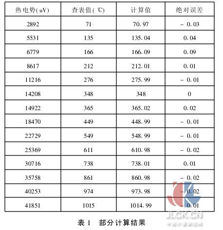出溫度值。由于在(ei,ei+2)內(nèi),將信號擬合成拋物線,更接近于電勢與溫度的實際,所以擬和的精度大大的提高,同時在相同的精度下,變量序列的步長取得相對較大,這樣可大大壓縮表格的數(shù)據(jù)量,從而極大節(jié)省了內(nèi)存空間。本文以K型鎳鉻—鎳硅為例,每50℃存儲一個熱電勢值(uV),若測溫范圍為-50~+1100℃,存儲的熱電勢值依次為:-1889,0,2022,4095,6137,8137, 10151, 12207, 14292, 16395, 18513, 20640, 22772, 24902,27022,29128, 31214, 33277, 35314, 37325, 39310, 41269, 43202,45108[3]。表1是對部分熱電勢的計算結(jié)果,由此可以看出,二次插值精度遠遠高于一維插值精度。