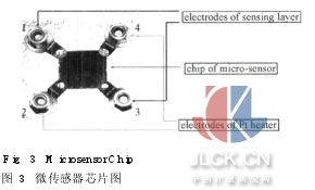 2氣體傳感器制作方法 圖2為氣體傳感器的制作流程圖,電子束蒸鍍(electron-beam evaporation)50nm鉻當(dāng)白金之黏著層,蒸鍍200nm白金當(dāng)作加熱器。并利用微影技術(shù)定義出兩種電極,之后再用剝離( lift-off)制程方式,將未曝光的金屬部分用丙酮溶液移除,產(chǎn)生所需要的金屬層。 3結(jié)果為討論 3. 1微傳感器芯片 圖3中所示為微傳感器芯片,為量測方便和散熱,我們采用云母片當(dāng)作基材,云母片為具有晶體管散熱、避免短路、絕緣及低損失的熱阻功能。1、3為傳感器的感測電極, 2、4為傳感器的加熱電極。