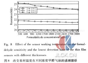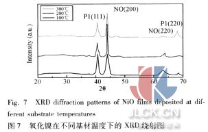 3. 4基材溫度對氧化鎳氣體傳感器的影響 利用X光繞射儀(XRD)分析其薄膜結(jié)構(gòu)及結(jié)晶度,實驗在濺鍍時基板溫度100~300℃、工作壓力為0. 01torr、射頻功率為200W及氧氣、氬氣流量比為1: 1的情況下,比較基板溫度的影響。圖7顯示在不同基板溫度下濺鍍氧化鎳薄膜之X光繞射圖。在100~300℃的基板溫度范圍下沉積之氧化鎳薄膜為NiO(200)的繞射峰出現(xiàn),由此可知在此一溫度范圍內(nèi)濺鍍氧化鎳薄膜的擇擾取向為NiO(200)。圖中顯示隨著濺鍍時之基板溫度的升高,NiO(200)的繞射峰強度有逐漸增強的趨勢。圖中也指出,隨著基板溫度的提高氧化鎳薄膜NiO(200)繞射峰之半高寬值減少,表示薄膜之結(jié)晶性變好。因為高的基板溫度,附著于基板表面的粒子獲得較大的能量,使晶粒具有較大的動能可移動到能量較小的位置,形成較完美的結(jié)晶薄膜。結(jié)果顯示以反應(yīng)性濺鍍沉積氧化鎳薄膜時,提高其基板溫可有效的改善結(jié)晶結(jié)構(gòu),進而提高點測器的靈敏度。 圖8為改變傳感器操作溫度之感測性能圖,當(dāng)操作溫度升高,粒子獲得較大的能量,使粒子有較大的動能可移動到能量較小的位置,有助于改善薄膜的結(jié)晶性,結(jié)晶性的提高,降低薄膜的電阻率,提高傳感器的靈敏度,如圖中顯示操作溫度是100℃時,靈敏度為0. 028 kohm/ppb,操作溫度為200℃,靈敏度為0. 1 kohm/ppb,操作溫度為300℃,其靈敏度為0. 47 kohm/ppb,得知當(dāng)操作溫度較高時,得到較高的斜率,斜率愈高,電阻的變化較明顯,較易判別甲醛氣體的濃度變化。