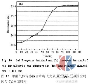 3. 6微氣體傳感器反應(yīng)時間與回復(fù)時間 在傳統(tǒng)甲醛濃度的檢測上,常需要耗費數(shù)小時到數(shù)天不等的時間,而傳感器則必需要求能實時偵測的能力。圖10(a)顯示氣體傳感器在甲醛濃度為3ppm,溫度為300℃的反應(yīng)時間只需70秒。圖10 (b)為其傳感器的甲醛濃度降為0ppm時,在溫度為300℃的回復(fù)時間約80秒左右,實驗證實此傳感器具有快速的反應(yīng)時間與回復(fù)性。