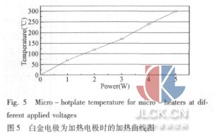 其反應(yīng)發(fā)生時會產(chǎn)生蟻酸或者二氧化碳以及水,當(dāng)氧化鎳與甲醛發(fā)生反應(yīng)后,會改變氧化鎳本身電導(dǎo)率大小,我們可以從電性方面的改變的大小,求得待測氣體的濃度大小。 1. 2氣體傳感器設(shè)計 本研究選用白金當(dāng)做微加熱器是利用其耐高溫以及物理現(xiàn)象穩(wěn)定,且在高溫時白金熱膨脹系數(shù)小的特性。加熱原理是利用金屬本身的電阻值來提供焦耳熱。當(dāng)電流經(jīng)過金屬物體時,因金屬物體本身有內(nèi)部電阻,當(dāng)電流通過金屬時會對金屬物體本身產(chǎn)生熱,計算公式為P=V2/R,其中P為焦耳熱、V為電壓、R為電阻。圖1顯示微型傳感器的設(shè)計圖樣,傳感器結(jié)合加熱裝置與感測電極在同一層,微型加熱器設(shè)計提供實時和精確的溫度控制能力,且指叉式電極容易直接量測感測層的電性和電阻的改變,濺鍍氧化鎳尺寸小,增加與氧化鎳的接觸面積,氧化鎳粒子有效的與甲醛發(fā)生反應(yīng),因而靈敏度和感測限度皆可提升。