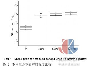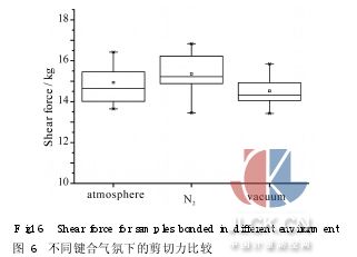 由圖中可以看出,燒結(jié)溫度越高,鍵合后的剪切力越大。燒結(jié)溫度為400℃和450℃時(shí),剪切力較低,僅為10kg,這是因?yàn)榉逯禍囟忍?沒(méi)有達(dá)到玻璃漿料的熔融溫度,漿料中的顆粒未完全熔融,不均勻的分布在鍵合層,導(dǎo)致鍵合強(qiáng)度的降低。掃描電鏡下觀察到的圖像如圖4所示,玻璃漿料分布不連續(xù),均勻性較差,這是影響鍵合強(qiáng)度的主要因素。圖5為500℃燒結(jié)后鍵合層形貌的掃描電鏡圖。與400℃的圖像相比較,玻璃漿料中的顆粒充分熔融,僅有較小的顆粒和氣孔。經(jīng)測(cè)量,在燒結(jié)溫度為500℃時(shí),剪切力平均值為15·2kg,與400℃和450℃的燒結(jié)溫度下的剪切力相比有了較大提高。由此說(shuō)明, 500℃以上的燒結(jié)溫度可達(dá)到較高的鍵合強(qiáng)度。然而,基于器件上金屬布線的限制,燒結(jié)溫度不能高于550℃(Al-Si共熔點(diǎn)577℃)。 3·3鍵合氣氛對(duì)鍵合強(qiáng)度的影響 圖6為不同鍵合氣氛下的剪切力測(cè)量值(預(yù)燒結(jié)溫度400℃,燒結(jié)溫度500℃)。從圖中可以看出,在空氣、氮?dú)夂驼婵罩械募羟辛Υ笮』疽恢?因此可以認(rèn)為,鍵合氣氛對(duì)鍵合強(qiáng)度的影響可以忽略不計(jì)。 3·4壓力對(duì)鍵合強(qiáng)度的影響 在燒結(jié)過(guò)程中需加以一定壓力,以保證鍵合強(qiáng)度及氣密性要求。圖7為不同壓力下的剪切力測(cè)量值(預(yù)燒結(jié)溫度400℃,燒結(jié)溫度500℃,氮?dú)鈿夥?。當(dāng)外加壓力為0時(shí),剪切力為8kg。當(dāng)外加壓強(qiáng)為3kPa時(shí),剪切力提高到了15kg,而再繼續(xù)增加到6kPa、12kPa時(shí),剪切強(qiáng)度值沒(méi)有明顯變化。這是因?yàn)轭A(yù)燒結(jié)后漿料表面凹凸不平,即使?jié){料中的顆粒完全熔融,在沒(méi)有施加外壓的情況下,表面張力的存在使得鍵合面未能完全接觸,鍵合層中含有氣泡和孔洞,影響了鍵合強(qiáng)度。所需的外壓只需克服漿料熔融時(shí)的表面張力,使鍵合面完全接觸,排出不平整處殘留的氣體。因此,施加外壓后鍵合強(qiáng)度顯著提高。