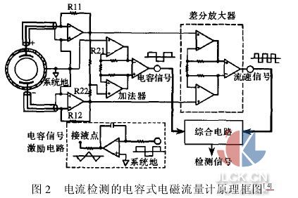 1引言 電容式電磁流量計(jì)是近年來電磁流量計(jì)的研究熱點(diǎn),由于采用大面積電極,并且電極與被測(cè)流體間有絕緣襯里隔離,從根本上解決了電極表面附著、腐蝕、摩擦等問題,對(duì)電極式電磁流量計(jì)難以測(cè)量的流體類型,如低電導(dǎo)率流體、泥漿混入型流體、附著型流體等,可以很好地完成檢測(cè),在很大程度上拓展了電磁流量計(jì)的適用范圍,在造紙、制糖、化工、冶煉等行業(yè)有著良好的應(yīng)用前景。 電容式電磁流量計(jì)是利用靜電電容來檢測(cè)感應(yīng)電動(dòng)勢(shì)的,由大面積電極板與所測(cè)流體通過絕緣襯里組成檢測(cè)電容,其電容值一般為幾十pF,因此要使信號(hào)順利通過,要求激磁頻率比較高,一般為幾百Hz,并且隨著流體電導(dǎo)率的下降,信號(hào)內(nèi)阻變得很大,干擾影響加劇,零點(diǎn)穩(wěn)定困難,使準(zhǔn)確檢出流速信號(hào)難度增大。 為了提高測(cè)試精度,除了改進(jìn)傳感器和激磁電路,研究信號(hào)的檢出方式,提高信號(hào)檢出能力也是非常重要的。目前應(yīng)用的信號(hào)檢出方式主要有兩種:一是直接檢測(cè)信號(hào)電壓,通過提高前置放大器的輸入電阻,盡量減少信號(hào)電壓的衰減,保證足夠的精度。二是采用“虛地”技術(shù),通過檢測(cè)信號(hào)電流,來獲得流速信號(hào)。 2電壓檢測(cè)方式 目前國內(nèi)市場(chǎng)上電容式電磁流量計(jì)主要有德國科隆公司、日本橫河電機(jī)和杭州大河科技等幾家公司的產(chǎn)品,它們都是采用電壓檢測(cè)作為信號(hào)檢出方式。為了保證足夠的檢測(cè)精度,除了良好的屏蔽外,主要是要提高前置放大器的輸入電阻,為了達(dá)到足夠高的輸入阻抗,一般需要采用自舉高阻抗輸入電路[1~3],其基本電路如圖1所示: