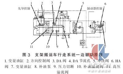 2.3 支架搬運(yùn)車 DA-HA 傳動(dòng)控制的應(yīng)用 (1)液壓泵—液壓馬達(dá)調(diào)速回路 如圖3 所示,支架搬運(yùn)車行走系統(tǒng)由2 套結(jié)構(gòu)原理相同而獨(dú)立的閉式系統(tǒng)組成,左右側(cè)車輪分別驅(qū)動(dòng),HA 控制的液壓馬達(dá)根據(jù)負(fù)載自動(dòng)調(diào)整其排量,DA 控制的泵隨發(fā)動(dòng)機(jī)的轉(zhuǎn)速和系統(tǒng)的壓力自行調(diào)整泵的排量,實(shí)現(xiàn)支架搬運(yùn)車的無級(jí)調(diào)速。 支架搬運(yùn)車要減速或停車制動(dòng)時(shí),只需適當(dāng)松開發(fā)動(dòng)機(jī)油門, 靠DA 控制泵就會(huì)相應(yīng)減少對馬達(dá)的液壓輸出,從而實(shí)現(xiàn)設(shè)備的減速和制動(dòng)。