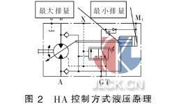 2.2 HA 控制 HA 控制根據(jù)外負(fù)荷自動(dòng)調(diào)節(jié)馬達(dá)排量與之適應(yīng),使液壓裝置保持合理的工作壓力,完成液壓傳動(dòng)裝置高效區(qū)、高生產(chǎn)率、合理負(fù)荷的選擇。 液壓原理圖如圖2 所示。 HA控制根據(jù)負(fù)荷壓力的變化來調(diào)節(jié)馬達(dá)排量:負(fù)荷扭矩增大使系統(tǒng)壓力升高時(shí),自動(dòng)增大馬達(dá)排量使壓力重新降低到比原來略高的水平;負(fù)荷扭矩減小使系統(tǒng)壓力降低時(shí),自動(dòng)減小馬達(dá)排量使壓力重新升高到比原來略低的水平;其結(jié)果是,盡管外界負(fù)荷扭矩有很大的變化,但系統(tǒng)的工作壓力則只有少量變化,從而使液壓泵和發(fā)動(dòng)機(jī)始終在各自額定的工況附近工作(泵在額定壓力和大排量附近,發(fā)動(dòng)機(jī)在額定功率附近),液壓馬達(dá)在額定壓力附近工作。 這即為HA 控制。