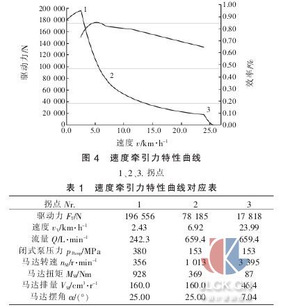 (2)DA-HA 系統(tǒng)在支架搬運(yùn)車中的速度牽引力特性曲線 由于液壓傳動(dòng)系統(tǒng)的復(fù)雜性,從發(fā)動(dòng)機(jī)、分動(dòng)箱、閉式泵、減速機(jī)、馬達(dá)和輪胎這些元部件中逐一匹配,對整車的驅(qū)動(dòng)力、速度、空載、滿載和爬坡角度等關(guān)鍵參數(shù)繪制了曲線,力求最佳選擇。 支架搬運(yùn)車技術(shù)參數(shù): 載重46 t, 馬達(dá)排量160,馬達(dá)減速器速比40,輪胎半徑0.750 m,空載重量29 000 kg,滿載重量75000 kg,滾動(dòng)阻尼系數(shù)0.045,輪胎空載半徑0.750 m,輪胎滿載半徑0.725 m,空載速度24 km/h,滿載速度10km/h,發(fā)動(dòng)機(jī)260 kW、2100 r/min,分動(dòng)箱速比if=nE/nPump=0.78,效 率0.98,閉式泵2× A4VG125,排量VPumpMax=125.0 cm3/r,減速器速比ij=40,效率0.96,馬達(dá)4×A6VM 160/63。 對應(yīng)圖4 能得出對應(yīng)拐點(diǎn)的數(shù)據(jù)參數(shù)列表 (見表1),得出此時(shí)整個(gè)系統(tǒng)的運(yùn)轉(zhuǎn)情況。