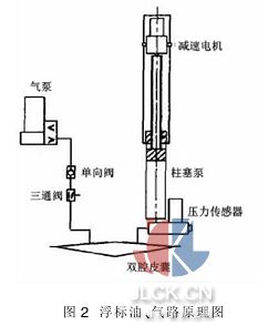3.2 浮標(biāo)內(nèi)部系統(tǒng) (1)內(nèi)腔真空處理 剖面探測(cè)浮標(biāo)長(zhǎng)期交替地在水面和水下 2 000m 處工作, 為防止浮標(biāo)體在水面低壓時(shí)出現(xiàn)泄漏,通常采用的是將浮標(biāo)內(nèi)部抽成真空狀, 對(duì)外形成負(fù)壓.在常壓時(shí)外界就已在上下端蓋預(yù)加一外壓力, 確保高低壓均不泄漏, 還可保護(hù)內(nèi)部電子器件減少氧化現(xiàn)象。 (2)高壓油路和氣路系統(tǒng)如圖 2 所示,油路其實(shí)很簡(jiǎn)單, 柱塞泵直通油囊。皮囊在浮標(biāo)殼體之外, 處在海水包圍中, 因此它所受到的外壓直接反映了海洋深度。氣囊中所充的氣體是浮標(biāo)殼體內(nèi)抽真空所剩余的殘留氣, 氣路中需要用單向閥和三通閥實(shí)現(xiàn)氣囊與殼體內(nèi)空間在特定位置處接通與關(guān)閉。 高壓柱塞泵: 柱塞泵的動(dòng)力是一臺(tái)微型直流電動(dòng)機(jī); 通過(guò)高減速比的微型減速器將電機(jī)轉(zhuǎn)速降低和輸出以較大的轉(zhuǎn)距, 使?jié)L珠絲杠旋轉(zhuǎn)帶動(dòng)活塞平移動(dòng), 使活塞足以推動(dòng)因 20 MPa 深海壓力產(chǎn)生1600 N 的阻力。 (3)為保證浮標(biāo)可靠上浮的專項(xiàng)設(shè)計(jì) ①設(shè)置輔助油缸,增大浮標(biāo)的上浮能力: 海水密度隨地理位置的分布會(huì)有較大區(qū)別, 要將浮標(biāo)用在不同海區(qū), 用戶會(huì)遇到專業(yè)性很強(qiáng)的參數(shù)重新設(shè)置問(wèn)題。此設(shè)計(jì)出于提高浮標(biāo)上浮能力,即確保浮標(biāo)可靠上浮, 又不需用戶針對(duì)不同海區(qū)的情況提出各自的要求。 從計(jì)算得知并經(jīng)實(shí)驗(yàn)驗(yàn)證, 浮標(biāo)從水下上浮到水面的能力與皮囊體積和浮標(biāo)本身體積之比有關(guān)(△V/V0),該比值愈大浮標(biāo)上浮能力愈強(qiáng)。但由于受到浮標(biāo)體積與耗電量須嚴(yán)格限制等原因, 不能隨意加大柱塞泵的油缸容積, 采用不消耗能量的預(yù)置力輔助油缸措施是加大 △V/V0值的方法之一, 借助壓縮氣體或彈簧在受外力不同時(shí)其活塞位移會(huì)發(fā)生變化來(lái)增大油囊體積的變化量。設(shè)計(jì)以某一預(yù)定壓力為分界皮囊中將有更多的油量出自輔助油缸,從而加大 △V 值,提高浮標(biāo)上浮能力。其工作原理如下,假如設(shè)定值是 3 MPa,在以下 3 種情況時(shí): 一是處在水面,外界壓力 p=0,輔助缸內(nèi)的油全部注入皮囊,使之膨漲到最大,穩(wěn)定漂浮;二是下潛,外界壓力 p 遂漸升高,即隨外界壓力的升高, 皮囊中的油逐漸被壓回輔助缸,3MPa 時(shí)皮囊收縮到最小值, 浮標(biāo)可潛入到預(yù)定深度;三是上浮,外界壓力 p<3 MPa,預(yù)置力將輔助缸油再次逐漸注入皮囊, 到達(dá)水面后皮囊又可漲到最大,該過(guò)程有助于浮標(biāo)上浮。 ②可以現(xiàn)場(chǎng)拆卸檢修和封裝的抽真空設(shè)計(jì):上蓋結(jié)構(gòu)特有的抽真空密封裝置, 使未布放的浮標(biāo)以在現(xiàn)場(chǎng)拆卸浮標(biāo)進(jìn)行內(nèi)部檢修。