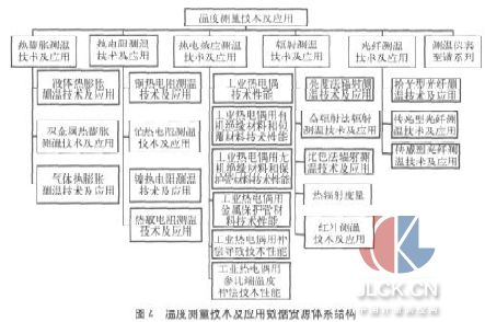 儀器儀表與檢測科學數(shù)據(jù)資源體系的建立參考了: 自然科學技術(shù)學科分類、產(chǎn)品分類代碼、國民經(jīng)濟行業(yè)分類代碼、專利文獻分類、科技文獻分類、國家863科技計劃領(lǐng)域( 主題) 劃分等資料, 同時對本領(lǐng)域現(xiàn)有科學數(shù)據(jù)資源分布、科學技術(shù)發(fā)展熱點和趨勢等進行調(diào)研。并征詢行業(yè)內(nèi)外專家意見后,提出了儀器儀表與檢測技術(shù)領(lǐng)域科學數(shù)據(jù)資源體系。該數(shù)據(jù)資源體系包括20個技術(shù)方面,每一技術(shù)方面又可根據(jù)數(shù)據(jù)資源的情況逐級細分到最多三層,以“ 溫度測量技術(shù)及應用”為例,顯示其逐級細分到三層的體系結(jié)構(gòu), 見圖1和圖2。