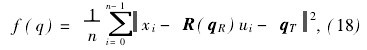(17) 使用四元數(shù)表示R3中的旋轉(zhuǎn),需要計算四個旋轉(zhuǎn)參數(shù)和三個平移參數(shù)來評估兩個點(diǎn)集之間的移動·將這些參數(shù)放入一個向量q=[qT,qR]中,qT表示平移向量,qR表示旋轉(zhuǎn)向量·配準(zhǔn)的目標(biāo)表達(dá)式就可以轉(zhuǎn)換為式(18),也就使得目標(biāo)函數(shù)f(q)的值最小