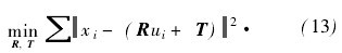 2空間配準(zhǔn)中的應(yīng)用 手術(shù)導(dǎo)航系統(tǒng)中,空間配準(zhǔn)(registration)主要用于手術(shù)前的計劃和手術(shù)中的處理[7,8]·通過對由位置傳感器確定的坐標(biāo)空間和術(shù)前多模態(tài)醫(yī)學(xué)圖像確定的坐標(biāo)空間配準(zhǔn),導(dǎo)航系統(tǒng)可以將術(shù)前重建所得的虛擬數(shù)據(jù)與術(shù)中空間位置的數(shù)據(jù)實(shí)時地聯(lián)系起來,這樣就消除了醫(yī)生僅憑主觀判斷將多模態(tài)醫(yī)學(xué)圖像與實(shí)際手術(shù)過程相匹配時可能引起的誤差,減小了手術(shù)的復(fù)雜性和危險性,縮短了手術(shù)時間[9]·空間配準(zhǔn)是一個坐標(biāo)空間和另一個坐標(biāo)空間一對一的映射或變換,即兩個不同空間中相對應(yīng)于同一醫(yī)學(xué)解剖特征的兩點(diǎn)之間的映射·空間配準(zhǔn)是手術(shù)導(dǎo)航系統(tǒng)中的一個十分關(guān)鍵的技術(shù)。 下面將詳細(xì)介紹四元數(shù)法在手術(shù)導(dǎo)航系統(tǒng)空間配準(zhǔn)中的應(yīng)用·為簡化起見,僅研究對應(yīng)空間點(diǎn)集的配準(zhǔn)方法。 2.1配準(zhǔn)方法 假設(shè)一一對應(yīng)的兩個空間點(diǎn)集U和X的坐標(biāo)已給定,每個點(diǎn)集有n個點(diǎn), U={ui,i=0,1,2,…, n}和X={xi,i=0,1,2,…, n},每對點(diǎn)ui,xi有m個坐標(biāo)ui=(ui1,ui2,…,uim),xi=(xi1,xi2,…,xim)·為了使它們配準(zhǔn)起來,就是要找到最優(yōu)的旋轉(zhuǎn)矩陣R和平移向量T,滿足目標(biāo)表達(dá)式