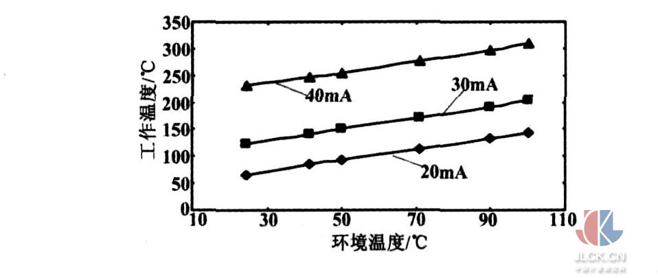 由圖2可以看出,在靜止氣流和恒流供電情況下,組合鉑膜探頭工作溫度隨環(huán)境溫度的提高基本呈線性提高,即探頭工作溫度與環(huán)境溫度之間的溫差基本保持不變。當(dāng)組合鉑膜探頭溫差較低時(shí),探頭的靈敏度不高,而溫差太大,容易造成探頭的損壞。所以,最終確定組合鉑膜探頭工作電流應(yīng)在30mA左右,這時(shí)探頭具有較高的靈敏度,探頭也不易損壞。