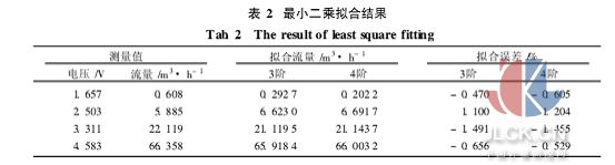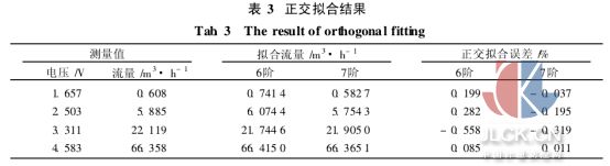 由表2可知,3階和4階的個(gè)別點(diǎn)擬合誤差較大,不能滿足流量檢測的精度要求。而如果增大擬合次數(shù),其系數(shù)矩陣不易于計(jì)算,在單片機(jī)中更難實(shí)現(xiàn)。因此,選取正交多項(xiàng)式為基作最小二乘擬合。假設(shè)測得的各實(shí)驗(yàn)點(diǎn)數(shù)據(jù)為(x0,f0), (x1,f1),…,(xn,fn),各數(shù)據(jù)點(diǎn)的權(quán)重均為1,選取的正交多項(xiàng)式簇為{φ0(x),φ1(x),…,φm(x)}。將基函數(shù)的系數(shù)矩陣變?yōu)閷顷?從而大大簡化計(jì)算,不需要解矩陣方程就可直接求解。
