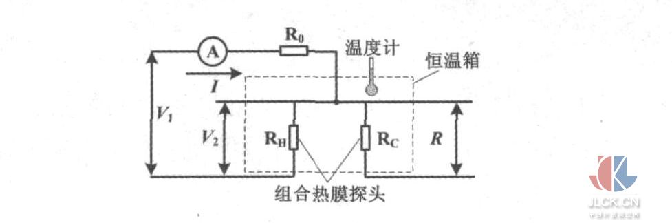 除了氣體的流量大小,氣流的溫度對鉑膜電阻的散熱也有很大影響,造成流量計(jì)的輸出在流量恒定的情況下也會隨氣流溫度的變化而變化。為了使流量傳感器的輸出僅隨流量變化,無論是傳統(tǒng)的熱分布型質(zhì)量流量計(jì),還是新型的浸入型質(zhì)量流量計(jì),在設(shè)計(jì)時(shí)必須考慮熱式探頭的溫度補(bǔ)償。而補(bǔ)償電路的設(shè)計(jì)與氣流溫度對鉑膜電阻的影響量即鉑膜電阻的溫度特性有關(guān)。通過對上文的分析可知,對鉑膜探頭的溫度特性研究極為重要。溫度特性實(shí)驗(yàn)方案如圖1所示。