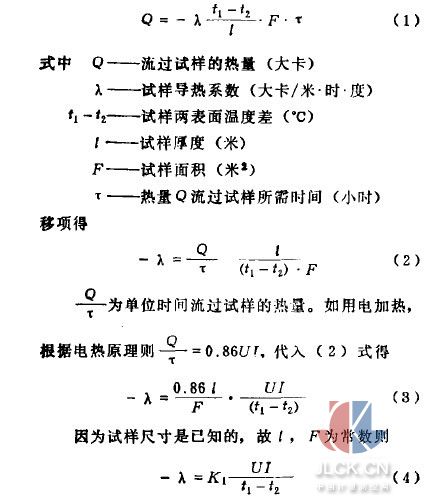 裝置非常簡單,只需一個主加熱器作熱源。在t1,t2,t3,t4處各安裝一對熱電偶。標準試樣與待測試樣均為直徑165xl5的板狀試樣;輔助試樣為直徑165x20豪米板狀試樣。它們的材質均相同。 3.試驗方法 將220伏交流電送入系統(tǒng)中,調節(jié)自藕變壓器,根據(jù)試驗溫度要求,使t4恒定在某一溫度,一般在200~300Oc內。恒溫十分鐘后即可用UJ一31型電位差計測試高溫點t1、中溫點t2和低溫點t3一組數(shù)據(jù),每隔5一10分鐘再測t1,t2,t3一次,共測5~6組數(shù)據(jù),以平均值計算入2。 該法測得的導熱系數(shù)其絕對誤差值△入為0.0063大卡/米·時·度,其誤差百分率為△入%=2.493%。 對導熱系數(shù)側定而言,這樣的誤差范圈是比較理想的。 摘自:中國計量測控網(wǎng)