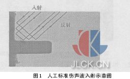 2.1探傷使用的人工標準傷為20 mm×0.1 mm×0.05 mm(長×寬×深),屬于開口型缺陷。探傷校驗時,標準傷間隙中充滿機油,鋼與機油聲阻抗值相差很大,鋼與機油界面的聲壓反射率RB為94%,幾乎全反射。如果調(diào)整正確,反射波將會被探頭良好接收(圖1)。