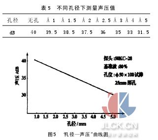 同理:可做不同的探頭,不同孔徑;或相同的孔徑,不同的探頭;或相同的探頭,不同的孔徑的孔深—聲壓曲線。 2.7“孔徑—聲壓曲線”制作 將兩探頭中心對準同一深度位置不同孔徑的長橫孔測量其穿透聲壓調(diào)節(jié)儀器,使透過波聲壓為80%滿刻度,測量聲壓值(表5),并用坐標表示出來(圖5)。