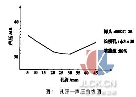 2.6“孔深—聲壓”曲線制作 將兩探頭中心對準試棒不同孔深同一直徑長橫孔,調(diào)節(jié)儀器,使接收的聲波為80%滿刻度,測量聲壓值(表4)。其孔深與聲壓曲線圖見圖4。