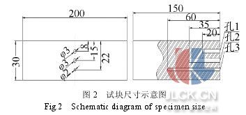 首先將接收到的數(shù)字化超聲信號作快速傅立葉變換,得到信號的全頻譜,并在一定的信號頻帶內(nèi)設(shè)置若干不同中心頻率、等帶寬的窄帶濾波器,超聲信號 通過這些窄帶濾波器后將得到一系列中心頻率不同的窄帶信號,這個過程稱為信號分離;再以分離后的不同中心頻率的窄帶信號為變量進(jìn)行統(tǒng)計運算,從而得到經(jīng)過 非線性濾波處理的輸出信號,也即信號的重建。 在信號分離階段,高斯形帶通濾波器比較適合處理服從正態(tài)分布的信號,并且其時頻特性均比較理想;信號恢復(fù)階段是整個分離譜技術(shù)的關(guān)鍵所在,它是 指對所有的分離信號引人非線性相關(guān)運算,以達(dá)到降低噪聲、提高信噪比的目的。目前常用的恢復(fù)算法有最小值算法、極性閾值法、線性平均法和最小值加極性閾值 算法幾種[6]。文獻(xiàn)[7]證實,以上算法中最小值算法對于提高信號的信噪比具有明顯的作用,但它的缺點是對濾波器數(shù)目比較敏感,導(dǎo)致此算法不夠穩(wěn)定。 本文采用等帶寬高斯型窄帶通濾波器構(gòu)成的濾波器組對原始信號進(jìn)行分離,信號恢復(fù)是在最小值算法的基礎(chǔ)上,采用分離信號被選中次數(shù)的加權(quán)恢復(fù)算法 [8]進(jìn)行信號恢復(fù)。該方法本質(zhì)上類似于維納濾波器的傳遞函數(shù),無需信號和噪聲頻譜的先驗知識,對濾波器的數(shù)目也不敏感,從而能自適應(yīng)地處理寬帶的目標(biāo)反 射脈沖波,達(dá)到濾波精度的要求。最小值被選中次數(shù)加權(quán)恢復(fù)算法的原理[8]為: 首先將檢測到的信號做傅立葉變換得到信號的幅度譜,并在一定的幅度能量頻帶內(nèi)設(shè)置若干不同中心頻率的窄帶濾波器,假定這些濾波器的數(shù)目為 N個,待處理的數(shù)字信號含有M 個采樣點,采樣周期為sT ,則數(shù)據(jù)的長度為 ( 1)sM T,可以從 N 個帶通濾波器輸出端得到 N 個備選的窄帶信號xiti =1,2, , N,每個窄帶信號都有各自特定的中心頻率。最小值法的原理就是在 M 個采樣點分別對 N 個窄帶信號 ( )ix t 求最小值,并以此最小值作為各瞬時點的信號輸出,此時輸出為 i =1 ,2,N}(符號與原符號相同),也就是說,需要在M 個采樣點處進(jìn)行 M 次選最小值的運算。如果單個窄帶信號被選中的次數(shù)為im ,則總選中次數(shù)為: ,由此可定義各窄帶信號ix 的權(quán)值 。在統(tǒng)計意義上,高信噪比頻帶信號被選中的次數(shù)是最多的,因而,在較大的im 處,該頻帶信號xi t 所對應(yīng)的中心頻率處將有一個較高的峰值。如果我們根據(jù)信噪比對信號進(jìn)行加權(quán),對具有較高信噪比的分離信號賦予較高的權(quán)值iw ,也即重建后的信號 ,那么按此方法恢復(fù)出來的信號必然能夠達(dá)到較高的信噪比。 3 實驗結(jié)果及分析 按照 TOFD 檢測標(biāo)準(zhǔn),實驗所用試塊為 150mm×200mm×30mm(長×寬×高)的鋼樣塊,試塊的側(cè)面從上到下分別打上直徑為 3、 3、 2毫米的橫穿孔,見圖 2。采用美國聲學(xué)物理公司的 IPR1210發(fā)射接收卡,射頻輸出口接到工控機(jī)上的 PCI8002數(shù)據(jù)采集卡。采集卡的采樣頻率為 40MHz。探頭選用標(biāo)稱角度為 60°,中心頻率選擇為 5MHz,晶片直徑為 6mm 的 TOFD 探頭。探頭分置于試塊模擬缺陷的兩邊,使模擬缺陷剛好位于兩探頭的中間,探頭間距為 S=1.73d,其中 d=22mm 為最大埋深,即缺陷軸線高度離板材表面距離。實驗采集到的原始信號及分離譜算法處理后的結(jié)果如圖 3。